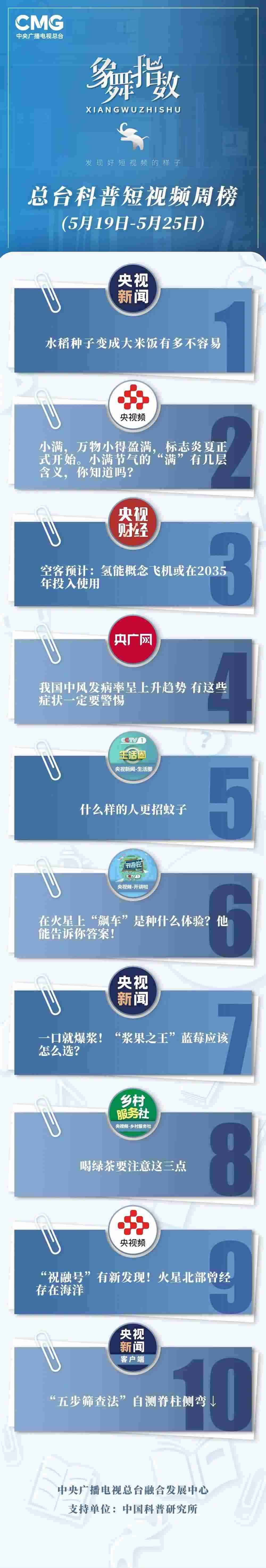 中央廣播電視總臺(tái)“象舞指數(shù)”評議品牌,推出科普短視頻周榜、總臺(tái)科普短視頻周榜。在2023年5月19日-5月25日,值得注目的內(nèi)容有: