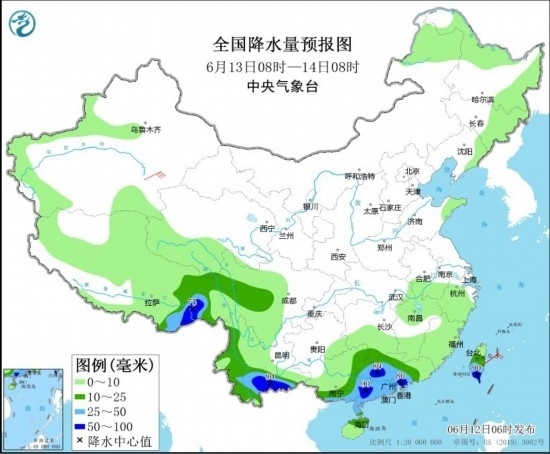圖2 全國降水量預報圖(6月12日08時-13日08時) 圖片來源:中央氣象臺網站