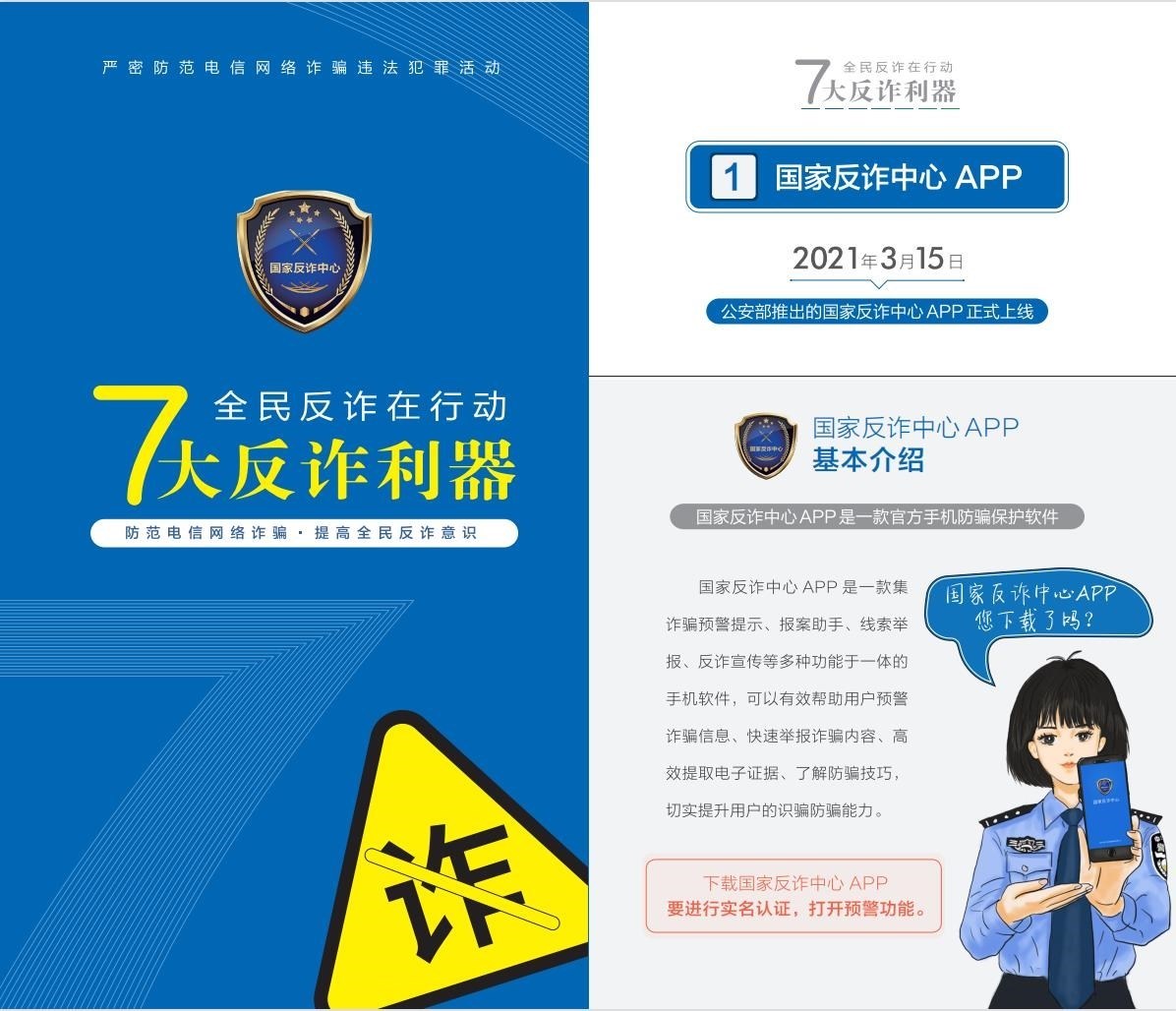 聚焦“關(guān)口前移、預(yù)防為先”,《手冊(cè)》詳細(xì)介紹了過(guò)去兩年里,公安部會(huì)同工信部、中國(guó)人民銀行聯(lián)合推出的七大反詐利器——國(guó)家反詐中心APP、96110預(yù)警勸阻專線、12381涉詐預(yù)警勸阻短信系統(tǒng)、全國(guó)移動(dòng)電話卡“一證通查”、云閃付APP“一鍵查卡”、反詐名片、全國(guó)互聯(lián)網(wǎng)賬號(hào)“一證通查2.0”的主要功能和下載查詢方法,鼓勵(lì)廣大群眾多下載多使用,共同構(gòu)筑攔截電信網(wǎng)絡(luò)詐騙的“防火墻”。