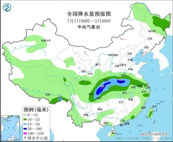 圖4 全國(guó)降水量預(yù)報(bào)圖(6月29日08時(shí)-30日08時(shí)) 圖自中央氣象臺(tái)網(wǎng)站