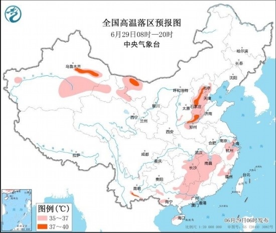 中央氣象臺(tái)6月29日06時(shí)繼續(xù)發(fā)布高溫黃色預(yù)警:預(yù)計(jì)6月29日白天,北京、天津、河北中南部、河南北部、山東西部、湖南東部、江西、浙江中北部、福建北部、廣西西部和東北部、廣東西北部以及內(nèi)蒙古西北部、新疆東部、甘肅河西等地的部分地區(qū)有35~37℃高溫天氣,其中,河北中南部、河南北部、新疆吐魯番盆地等地局地最高氣溫可達(dá)38~39℃(見圖3)。
