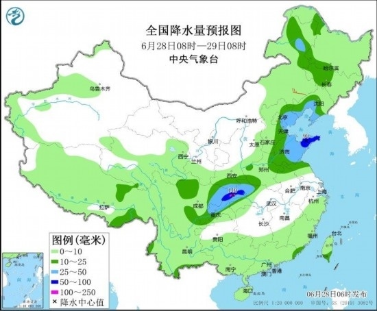 6月28日08時(shí)至29日08時(shí),內(nèi)蒙古東北部、東北地區(qū)西部、遼東半島、西北地區(qū)東南部、華北中東部、黃淮東部、江漢西部、川西高原北部、西南地區(qū)東部等地部分地區(qū)有中到大雨,其中,山東半島、湖北西部、四川盆地東北部、重慶北部等地部分地區(qū)有暴雨或大暴雨(100~140毫米)。內(nèi)蒙古東南部部分地區(qū)有4~5級(jí)風(fēng)(見圖3)。