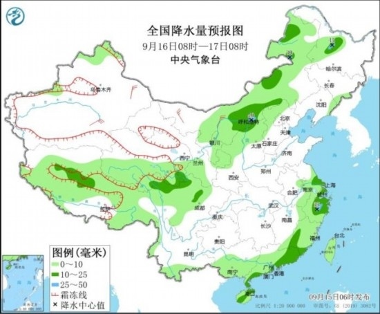 全國降水量預(yù)報圖(9月15日08時-16日08時)