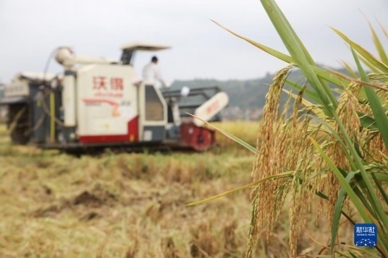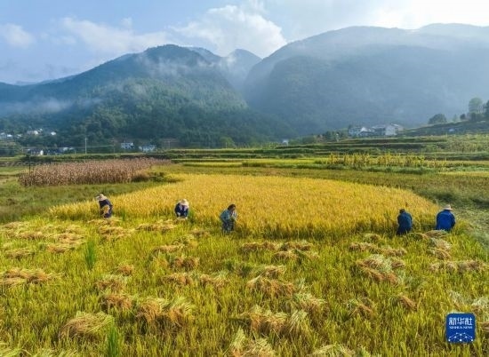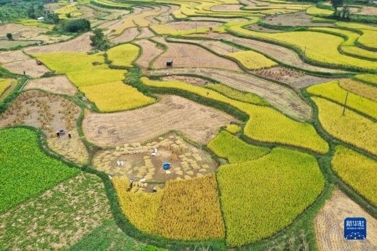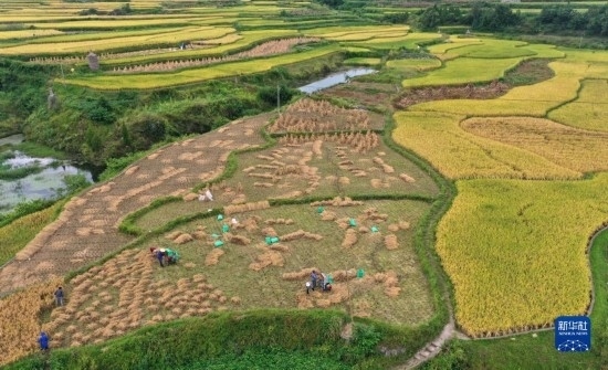 金秋時(shí)節(jié),各地農(nóng)民搶抓晴好天氣忙收獲,田間地頭一派繁忙景象。新華社發(fā)(胡攀學(xué) 攝)
