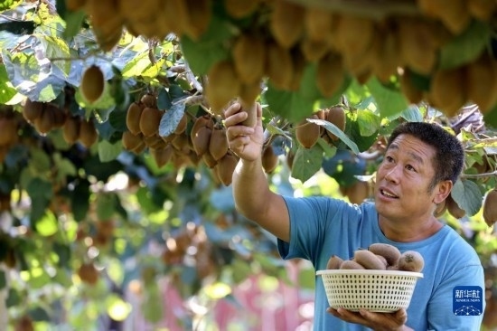 9月14日,農(nóng)民在河南省駐馬店市驛城區(qū)諸市鎮(zhèn)石莊村獼猴桃種植園采摘獼猴桃。