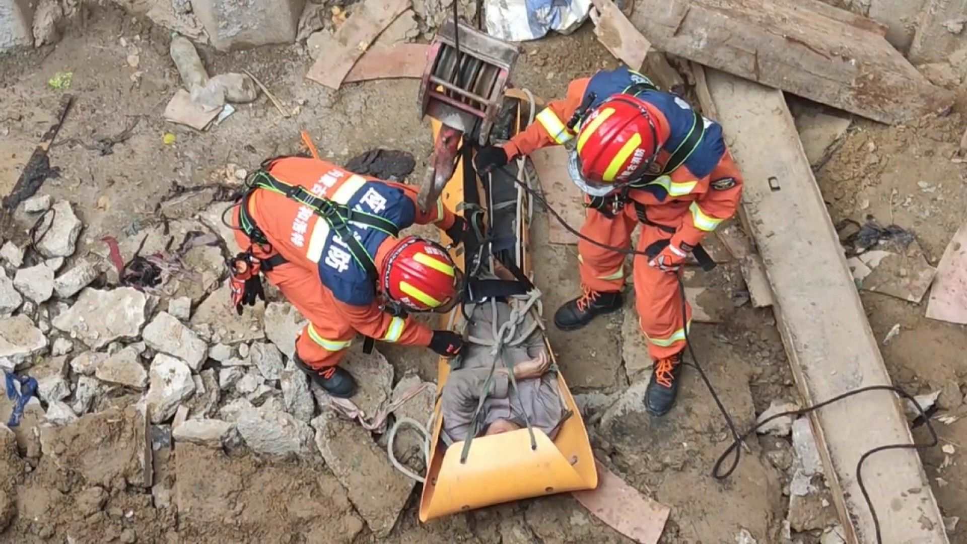 現場指揮員立即組織救援人員穿戴好防護裝備,攜帶多功能擔架并利用附近施工吊車下降到被困人員位置,針對被困人員受傷部位做好保護措施后,將被困男子轉移至擔架上。