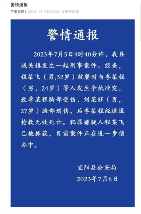 ·河南宜陽多名男子街頭起沖突1人胸部被扎,警方通報:致1死1傷,嫌疑人已被抓獲。
