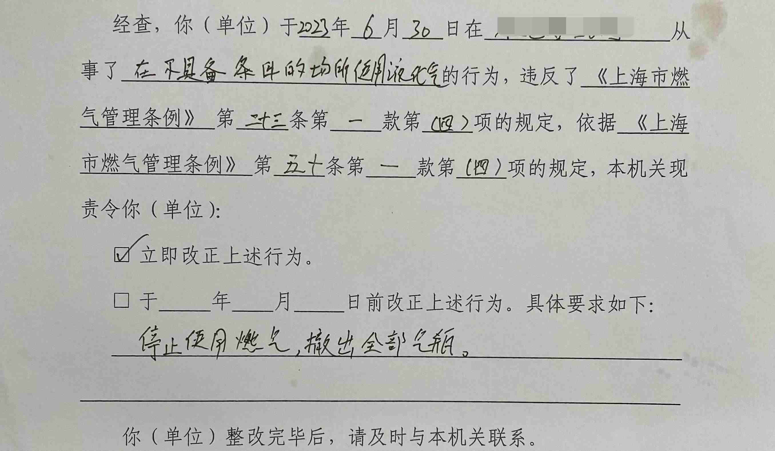 這并不是一次平常的燃?xì)庥猛旰蟾鼡Q空瓶。大概一個小時前,市住建委相關(guān)部門的檢查人員走進(jìn)餐館,檢查后責(zé)令整改,并在整改完成前暫停燃?xì)夤?yīng)。