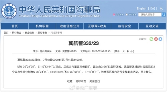 ·航行警告!7月10日0時至7月14日24時,渤海部分海域進(jìn)行實(shí)彈射擊活動,禁止駛?cè)搿?/p>