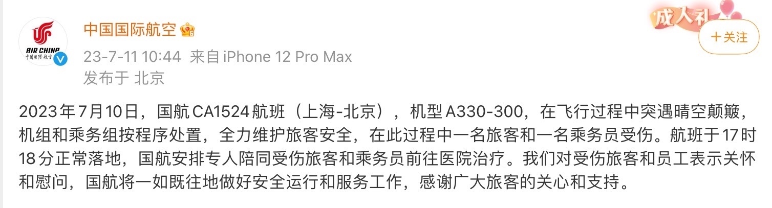 7月11日,中國國際航空在其官方微博發(fā)布通報:2023年7月10日,國航CA1524航班(上海-北京),機(jī)型A330-300,在飛行過程中突遇晴空顛簸,機(jī)組和乘務(wù)組按程序處置,全力維護(hù)旅客安全,在此過程中一名旅客和一名乘務(wù)員受傷。航班于17時18分正常落地,國航安排專人陪同受傷旅客和乘務(wù)員前往醫(yī)院治療。