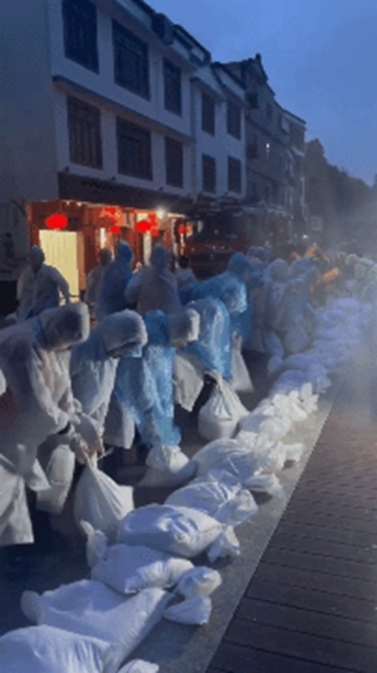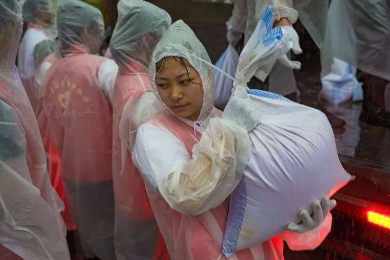 “加快速度裝好沙包!”“一個一個往后傳!”按照錢排鎮(zhèn)政府的統(tǒng)一部署,在保證安全的前提下,200余名學(xué)生志愿者參與沙袋填裝、搬運和堆疊等臺風(fēng)防御工作。