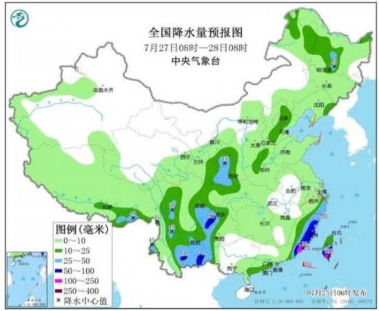 圖3 全國降水量預(yù)報(bào)圖(7月25日08時(shí)-26日08時(shí))
