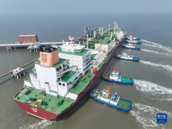 一艘LNG運輸船靠泊在唐山港曹妃甸港區(qū)(2023年6月18日攝,無人機(jī)照片)。新華社發(fā)(趙亮攝)