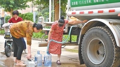 8月4日,河北涿州市新星小區(qū),居民從供水車接水。新華社記者 牟 宇攝
