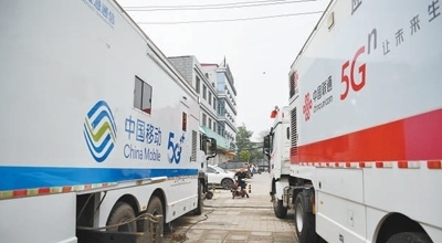 8月3日,應(yīng)急通信車輛在河北涿州市第三中學(xué)安置點外保障通信。新華社記者 牟 宇攝
