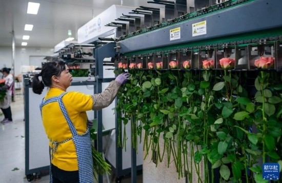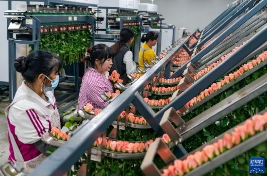 在云天化晉寧花卉產(chǎn)業(yè)現(xiàn)代化示范園內(nèi),花農(nóng)們將預冷處理后的鮮花放入自動分揀流水線(7月12日攝)。新華社記者 崔文 攝