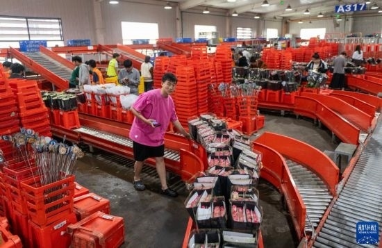這是云天化晉寧花卉產(chǎn)業(yè)現(xiàn)代化示范園內(nèi)的鮮花包裝流水線(7月12日攝)。新華社記者 陳欣波 攝