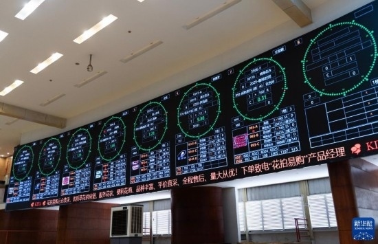 這是昆明國際花卉拍賣交易中心拍賣大廳的大屏上實時顯示的鮮花信息(7月13日攝)。新華社記者 陳欣波 攝