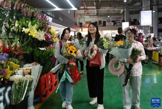 幾名外地游客在昆明斗南花卉市場內(nèi)購買鮮花(7月13日攝)。新華社記者 陳欣波 攝