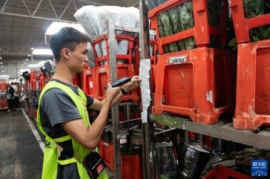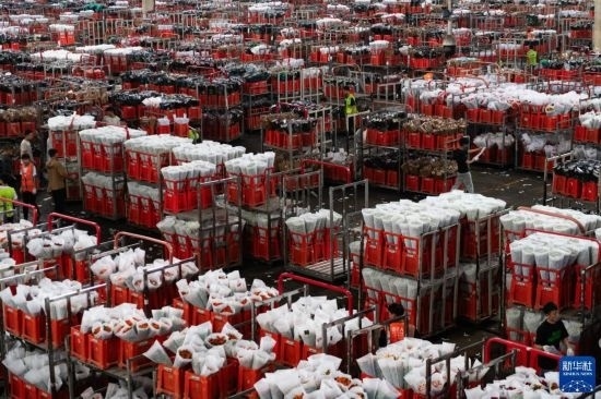 一名工作人員在昆明國際花卉拍賣交易中心內(nèi)對臺車上存放的鮮花進行掃碼(7月13日攝)。新華社記者 陳欣波 攝