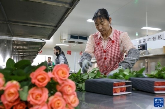 在云天化晉寧花卉產(chǎn)業(yè)現(xiàn)代化示范園內(nèi),花農(nóng)對鮮花進行簡單打包(7月12日攝)。新華社記者 陳欣波 攝