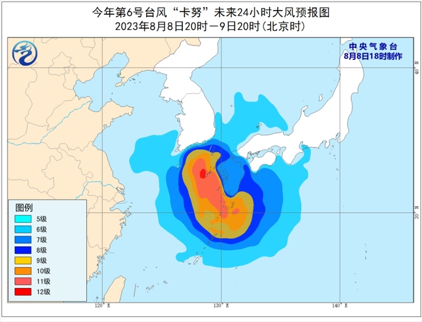 受“卡努”影響,8月8日至9日,巴士海峽、臺(tái)灣海峽北部、臺(tái)灣以東洋面、東海南部和東部及釣魚島附近海域有6級(jí)至7級(jí)大風(fēng),東海東部部分海域風(fēng)力可達(dá)8級(jí)至10級(jí),“卡努”中心經(jīng)過(guò)的附近海域風(fēng)力可達(dá)11級(jí)至12級(jí),陣風(fēng)13級(jí)至14級(jí)。