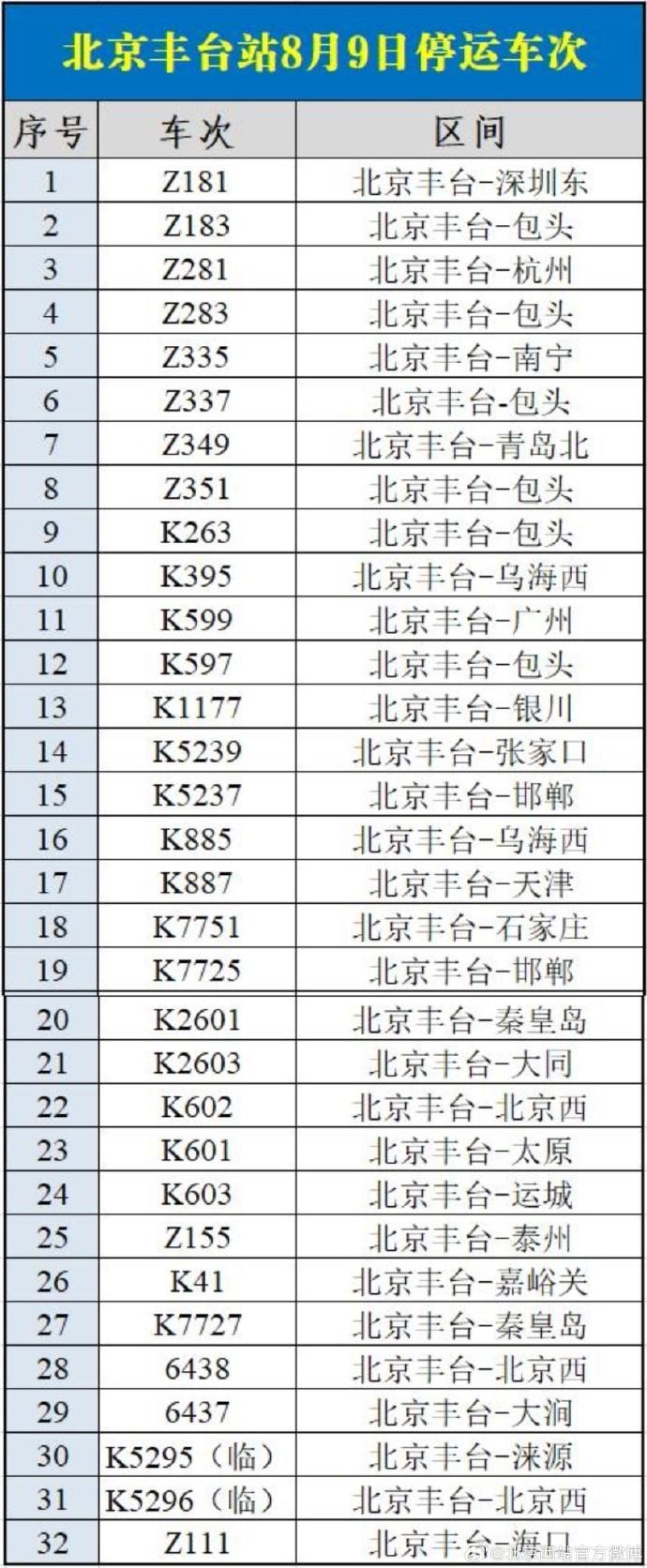 8月9日北京西站、北京豐臺站部分列車停運