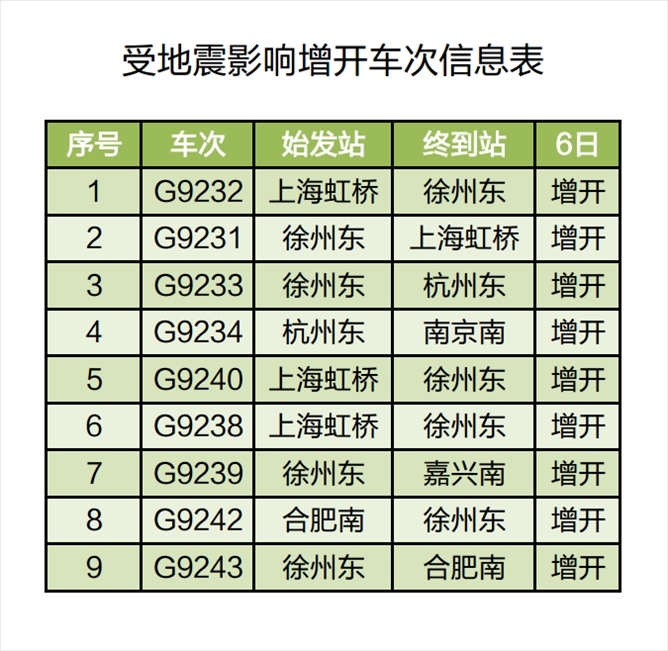 央視網(wǎng)消息:據(jù)長三角鐵路微信公眾號6日消息,受8月6日山東省德州市平原縣發(fā)生5.5級地震影響,為確保列車運行安全,鐵路部門計劃對途經(jīng)京滬高鐵部分列車采取限速、停運等措施;同時,根據(jù)旅客出行需要,計劃增開途經(jīng)京滬高鐵長三角管內(nèi)區(qū)段部分列車,滿足管內(nèi)旅客出行需要。截至當日11時30分,計劃停運92趟列車、增開9趟列車。