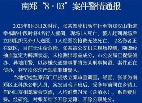 ·陜西漢中市一正科級(jí)公職人員張某,醉酒開(kāi)車撞倒4人,致2死2傷。張某被開(kāi)除黨籍、公職。