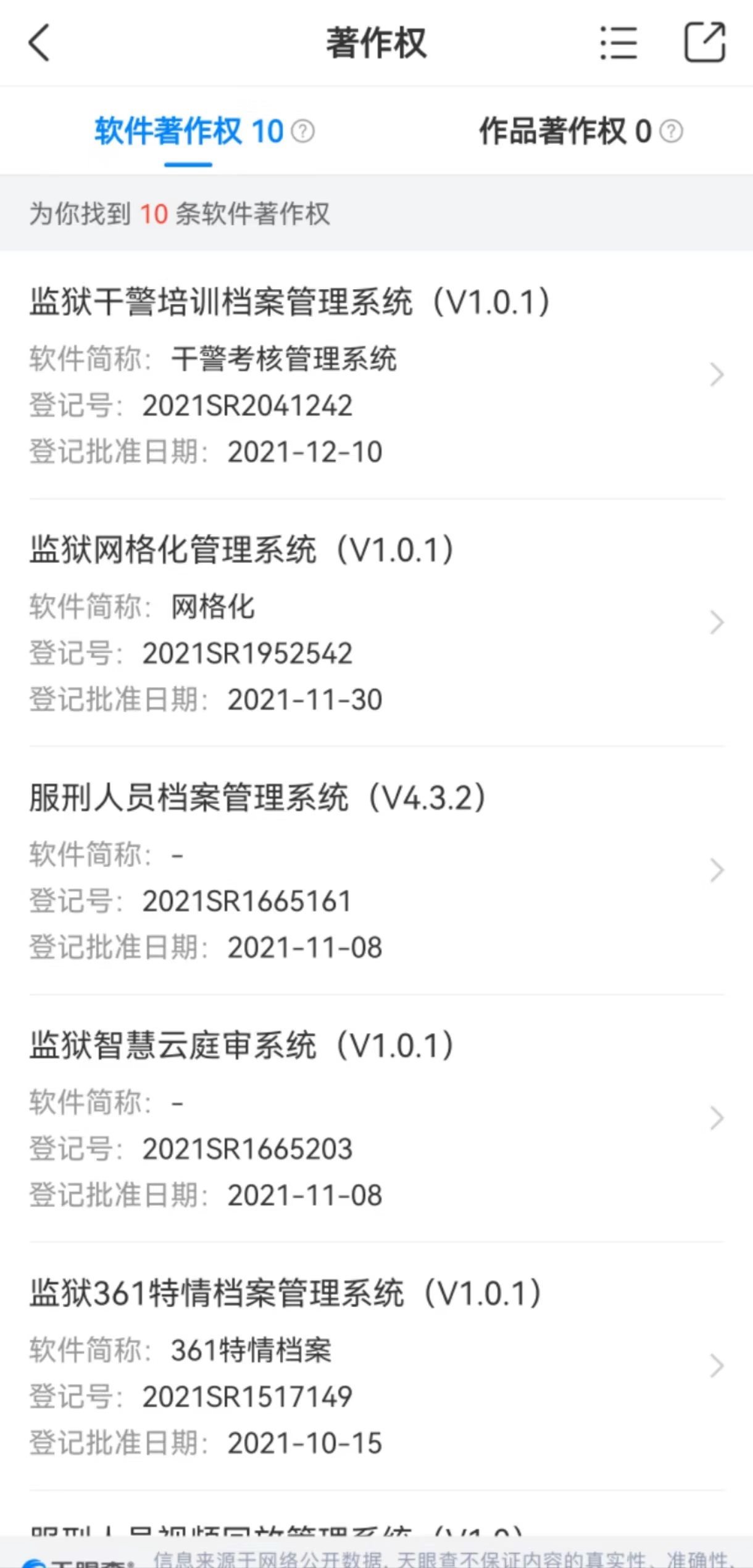 如上述立馳信息在官網(wǎng)中的自我介紹,澎湃新聞通過天眼查App檢索發(fā)現(xiàn),2021年一整年,立馳信息就獲批登記了包括上述“親情會見1.0”在內(nèi)的多個涉監(jiān)獄管理的系統(tǒng)。如監(jiān)獄固定資產(chǎn)管理系統(tǒng)、點名管理系統(tǒng)、服刑人員會見管理系統(tǒng)、監(jiān)獄干警培訓(xùn)檔案管理系統(tǒng)等共計10項。