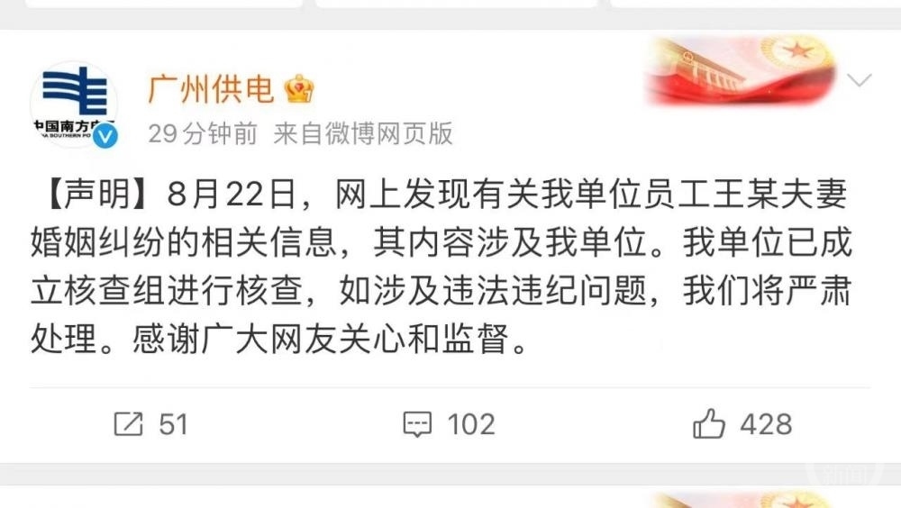 8月22日晚間,廣州供電局官方社交賬號(hào)發(fā)布聲明稱:“8月22日,網(wǎng)上發(fā)現(xiàn)有關(guān)我單位員工王某夫妻婚姻糾紛的相關(guān)信息,其內(nèi)容涉及我單位。我單位已成立核查組進(jìn)行核查,如涉及違法違紀(jì)問(wèn)題,我們將嚴(yán)肅處理。感謝廣大網(wǎng)友關(guān)心和監(jiān)督?!?/p>