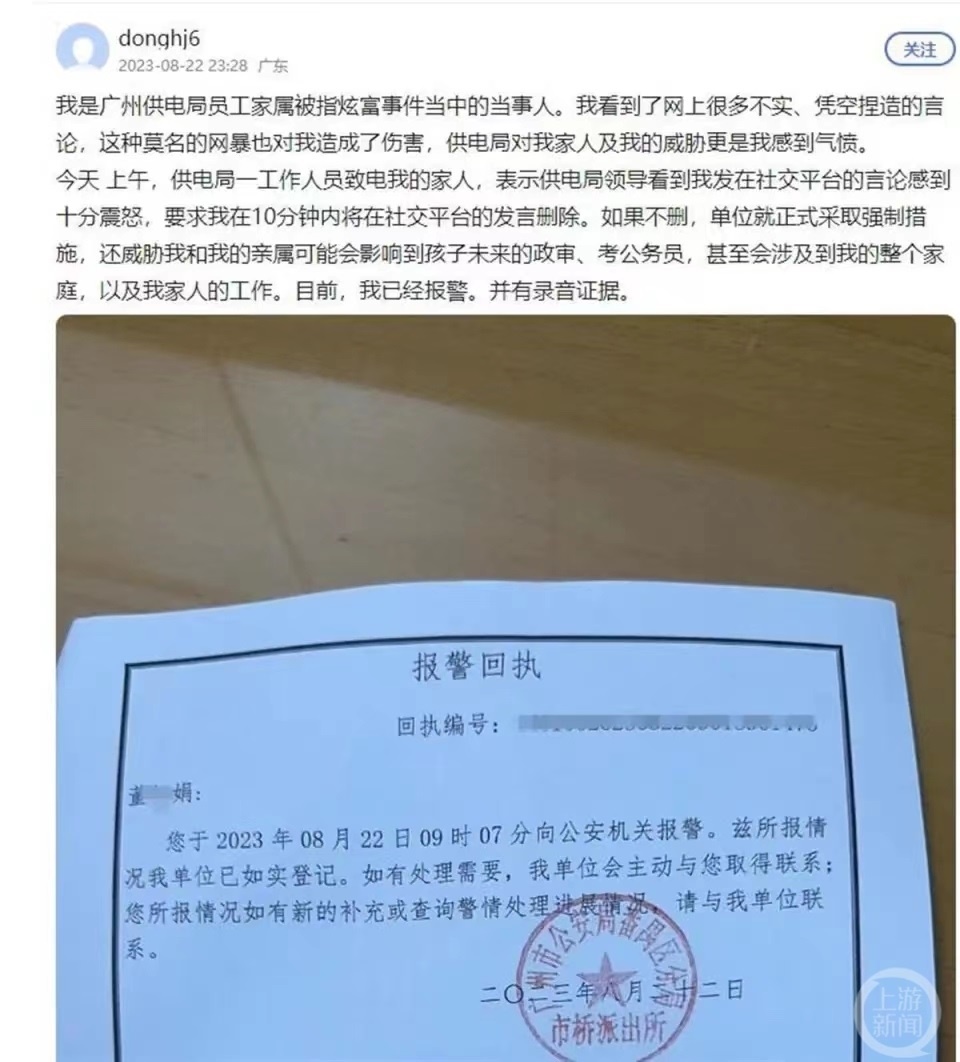 22日晚23時(shí),自稱是舉報(bào)當(dāng)事人阿娟的網(wǎng)友發(fā)布了報(bào)警回執(zhí),并發(fā)帖稱當(dāng)日上午,供電局一工作人員致電她的家人,“表示供電局領(lǐng)導(dǎo)看到我發(fā)在社交平臺(tái)的言論感到十分震怒,要求我在10分鐘內(nèi)將在社交平臺(tái)的發(fā)言刪除。如果不刪,單位就正式采取強(qiáng)制措施,還威脅我和我的親屬,(此舉)可能會(huì)影響到孩子未來(lái)的政審、考公務(wù)員,甚至?xí)婕暗轿业恼麄€(gè)家庭,以及我家人的工作。目前,我已經(jīng)報(bào)警。并有錄音證據(jù)?!?/p>