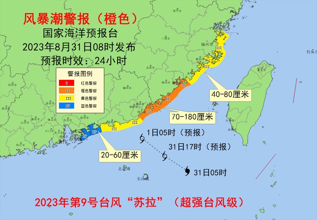 預(yù)計8月31日上午至9月1日中午,福建福州至泉州沿海將出現(xiàn)40到80厘米的風(fēng)暴增水,福建廈門至廣東汕尾沿海將出現(xiàn)70到180厘米的風(fēng)暴增水,廣東惠州和深圳沿海將出現(xiàn)20到60厘米的風(fēng)暴增水。福建省廈門市、漳州市、廣東省潮州市和汕頭市的風(fēng)暴潮預(yù)警級別為橙色,福建省福州市、莆田市、泉州市、廣東省揭陽市和汕尾市的風(fēng)暴潮預(yù)警級別為黃色。