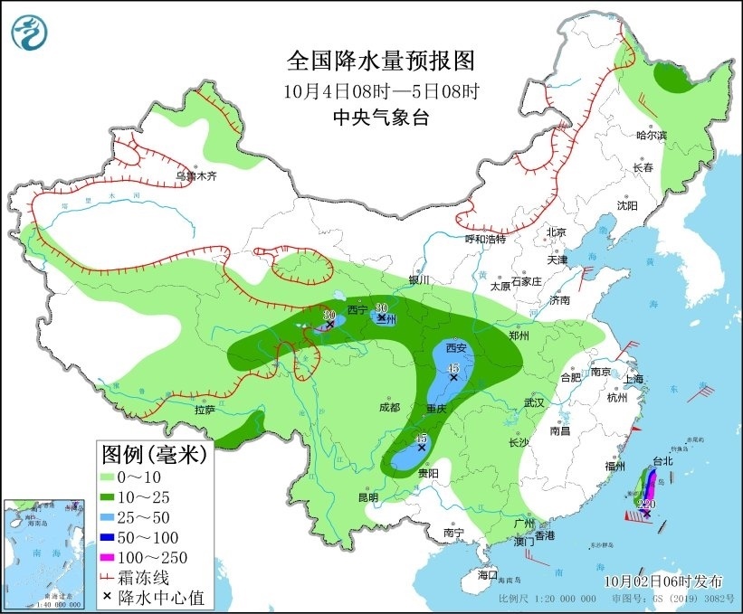 10月4日08時至5日08時,西藏東南部、青海中東部、甘肅中南部等地部分地區(qū)有中到大雪或雨夾雪,局地有暴雪。黑龍江北部、陜西中南部、四川東部、重慶、貴州西部、湖北西北部、河南西部以及臺灣島大部等地部分地區(qū)有中到大雨,其中,臺灣島東部和南部等地部分地區(qū)有暴雨或大暴雨(100~220毫米)。內(nèi)蒙古中部、黑龍江西南部、山東中部等地部分地區(qū)有4~6級風(fēng)。渤海、渤海海峽、黃海大部、東海北部將有6~7級風(fēng)、陣風(fēng)8級,東海西南部海域風(fēng)力將有7~8級風(fēng)、陣風(fēng)9級。臺灣以東洋面將有12~14級風(fēng)、陣風(fēng)15級,臺灣海峽將有10~12級風(fēng)、陣風(fēng)13級,巴士海峽將有11~12級風(fēng)、陣風(fēng)13級(見圖3)。