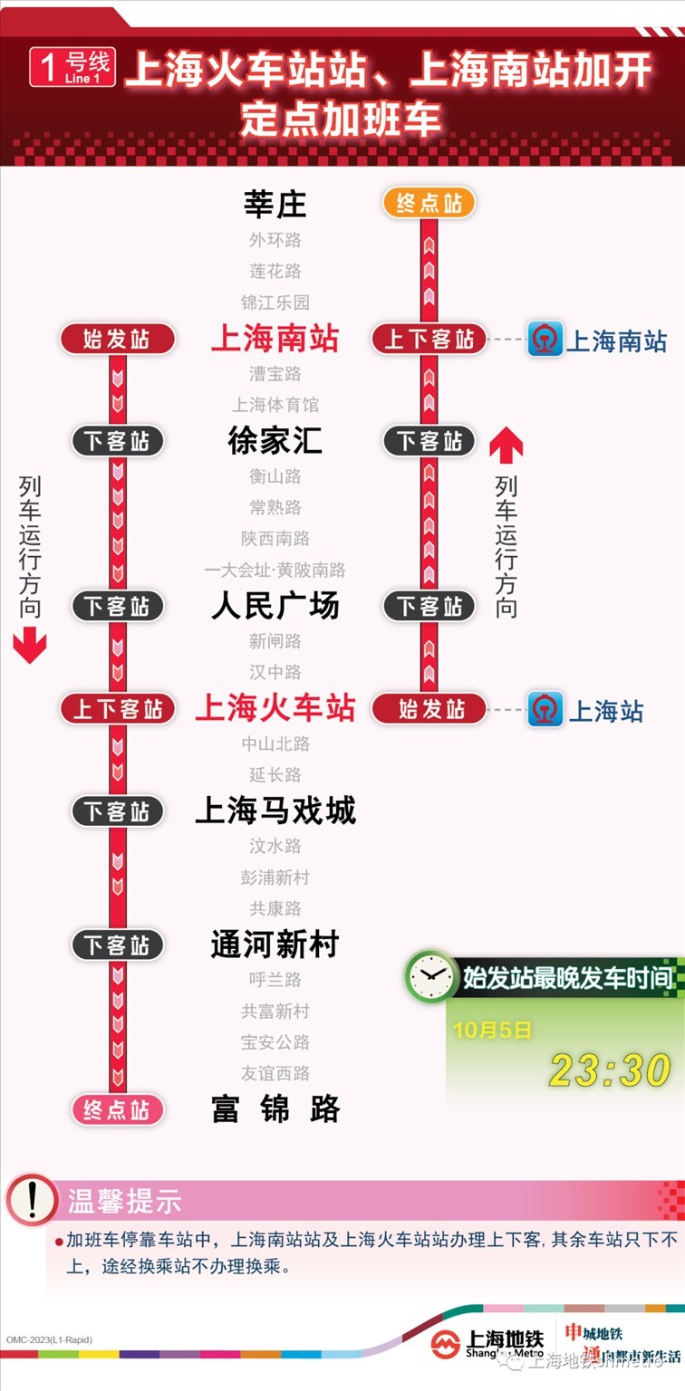 此外為做好節(jié)假日返程期間上海火車站、虹橋火車站、上海南站的夜間客流疏散工作,10月5日,地鐵1號(hào)線在圖定基礎(chǔ)上實(shí)施定點(diǎn)加開方案,加開末班車發(fā)車時(shí)間至23:30;另10月8日地鐵2號(hào)線增加定點(diǎn)加班車班次,加開末班車發(fā)車時(shí)間至次日0:00。