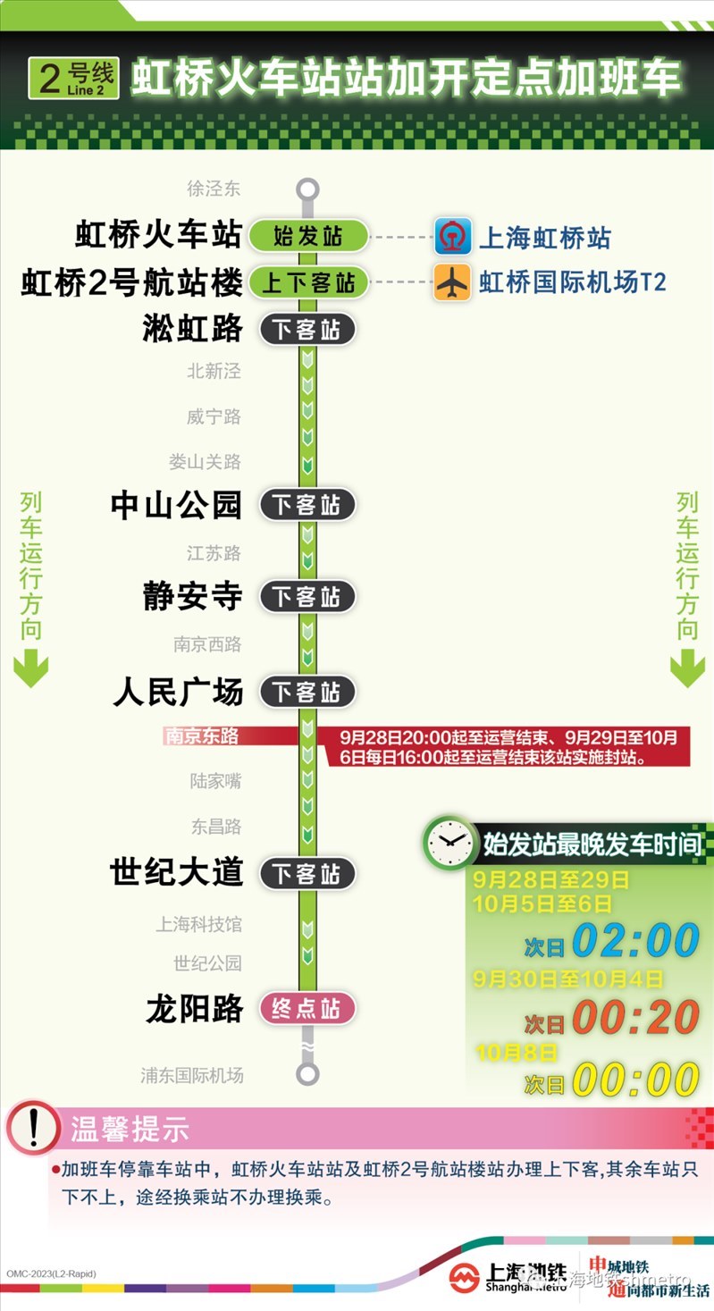 此外,9月28日20:00至運(yùn)營(yíng)結(jié)束,以及9月29日至10月6日的每日16:00至運(yùn)營(yíng)結(jié)束,地鐵2、10號(hào)線南京東路站,14號(hào)線豫園站計(jì)劃實(shí)施封站跳停。