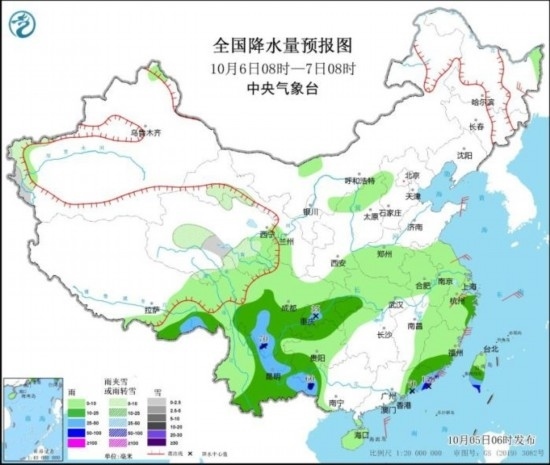 全國(guó)降水量預(yù)報(bào)圖(10月5日08時(shí)-6日08時(shí))