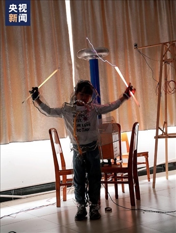 實驗展示過程中,屈老師手持熒光燈管,逐漸靠近特斯拉線圈,轉瞬之間,一道電流好像穿過他的身體,形成絢麗的火花,現(xiàn)場畫面仿佛置身科幻電影。