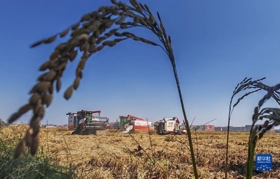 10月18日,湖南省衡陽市衡山縣白果鎮(zhèn),農(nóng)民在收割晚稻。