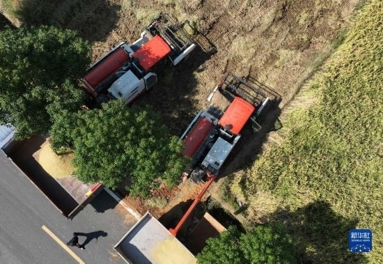 10月18日,湖南省衡陽市衡山縣白果鎮(zhèn),農(nóng)民在收割晚稻(無人機照片)。