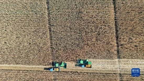 10月19日,在中國科學(xué)院“黑土糧倉”科技會(huì)戰(zhàn)長春示范區(qū)公主嶺示范基地,工作人員駕駛農(nóng)機(jī)收獲玉米(無人機(jī)照片)。