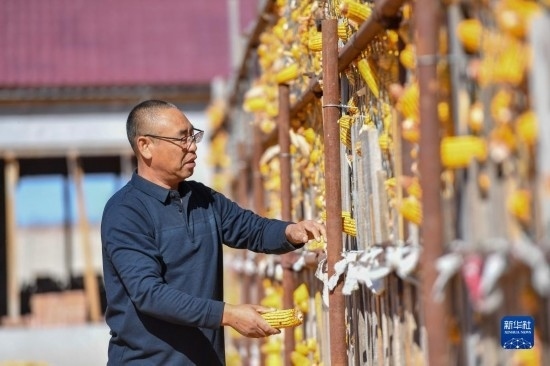 10月19日,在吉林省公主嶺市友忠種植農(nóng)民專業(yè)合作社,理事長孫友忠查看科學(xué)儲(chǔ)糧倉中的玉米儲(chǔ)存情況。