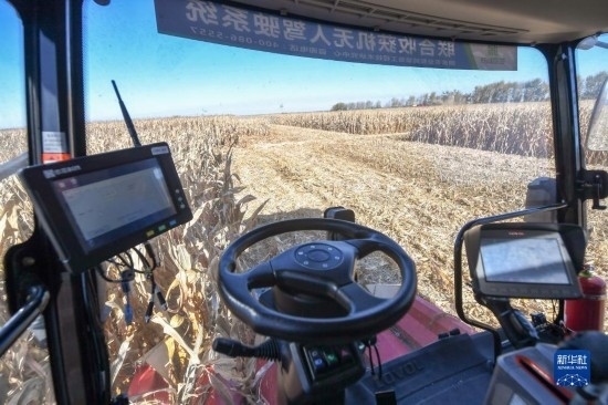 10月19日,在中國科學(xué)院“黑土糧倉”科技會(huì)戰(zhàn)長春示范區(qū)公主嶺示范基地,無人駕駛農(nóng)機(jī)在收獲玉米。