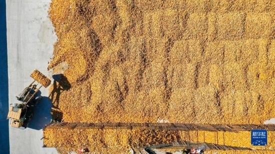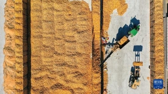 10月19日,在吉林省公主嶺市友忠種植農(nóng)民專業(yè)合作社,農(nóng)民將收獲的玉米放入科學(xué)儲(chǔ)糧倉(無人機(jī)照片)。