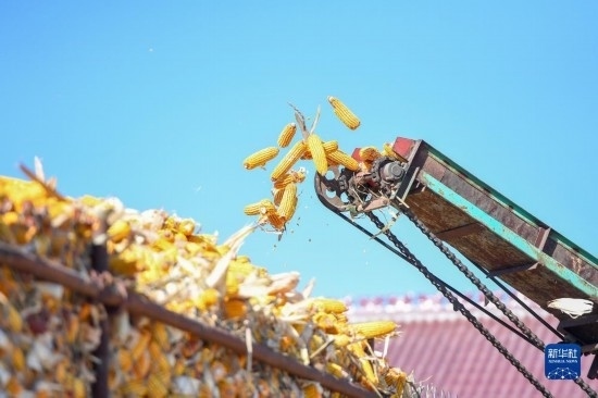 10月19日,在吉林省公主嶺市友忠種植農(nóng)民專業(yè)合作社,農(nóng)民將收獲的玉米放入科學(xué)儲(chǔ)糧倉。