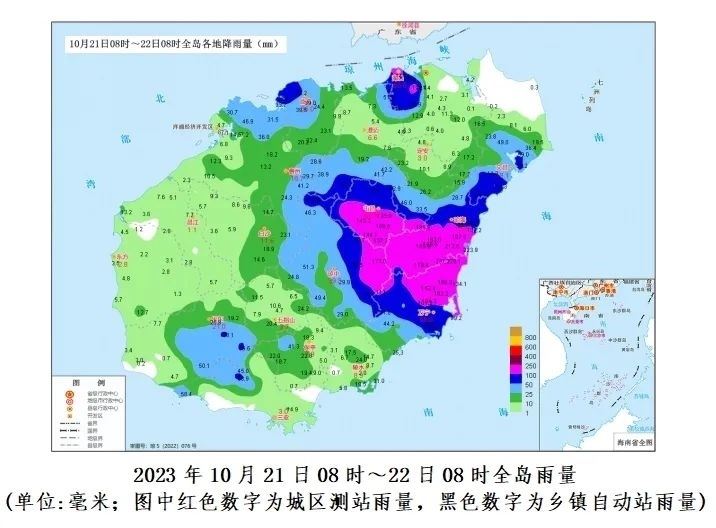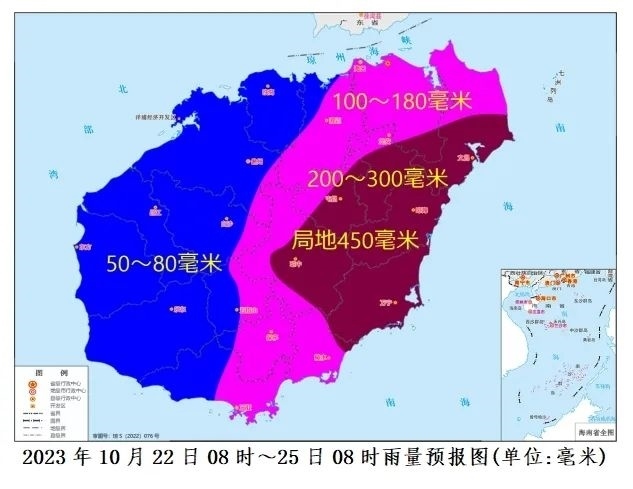 預(yù)計,10月22日08時~25日08時各地累積雨量:文昌、瓊海、瓊中、屯昌和萬寧200~300毫米、局地450毫米,??凇⒊芜~、定安、保亭、陵水和三亞100~180毫米,其余市縣50~80毫米。
