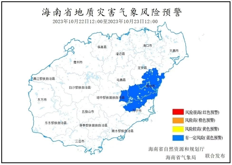 海南省自然資源和規(guī)劃廳、海南省氣象局2023年10月22日10時聯(lián)合發(fā)布地質(zhì)災(zāi)害氣象風(fēng)險預(yù)警:根據(jù)海南省氣象臺前期降雨實(shí)況和未來24小時降雨預(yù)報,預(yù)計未來24小時(2023年10月22日12:00-10月23日12:00)瓊海市全境,萬寧市龍滾鎮(zhèn)、三更羅鎮(zhèn)、北大鎮(zhèn),瓊中縣中平鎮(zhèn)降雨誘發(fā)地質(zhì)災(zāi)害有一定風(fēng)險,為Ⅳ級風(fēng)險預(yù)警(藍(lán)色預(yù)警)。請上述市縣、鄉(xiāng)鎮(zhèn)政府及有關(guān)部門做好地質(zhì)災(zāi)害防御工作。