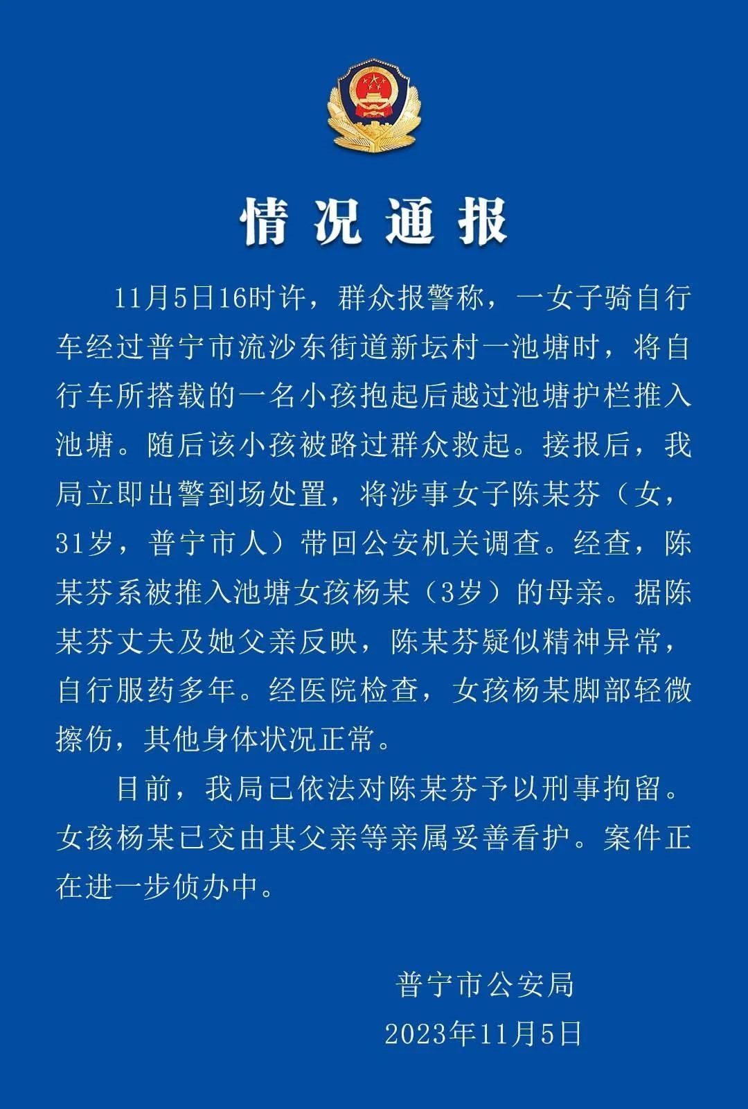 ·警方通報女子騎車到橋上將孩子推入池塘:該女子疑似精神異常。