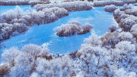 黑龍江大興安嶺現(xiàn)霧凇景觀,銀枝玉掛千姿百媚。