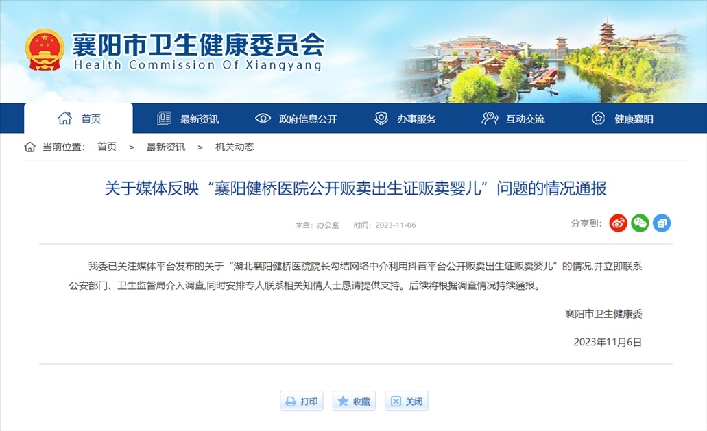 ·醫(yī)院院長被舉報涉嫌販賣出生證,襄陽衛(wèi)健委通報:聯(lián)系公安部門、衛(wèi)生監(jiān)督局介入調(diào)查,同時安排專人聯(lián)系相關(guān)知情人士懇請?zhí)峁┲С帧:罄m(xù)將根據(jù)調(diào)查情況持續(xù)通報。